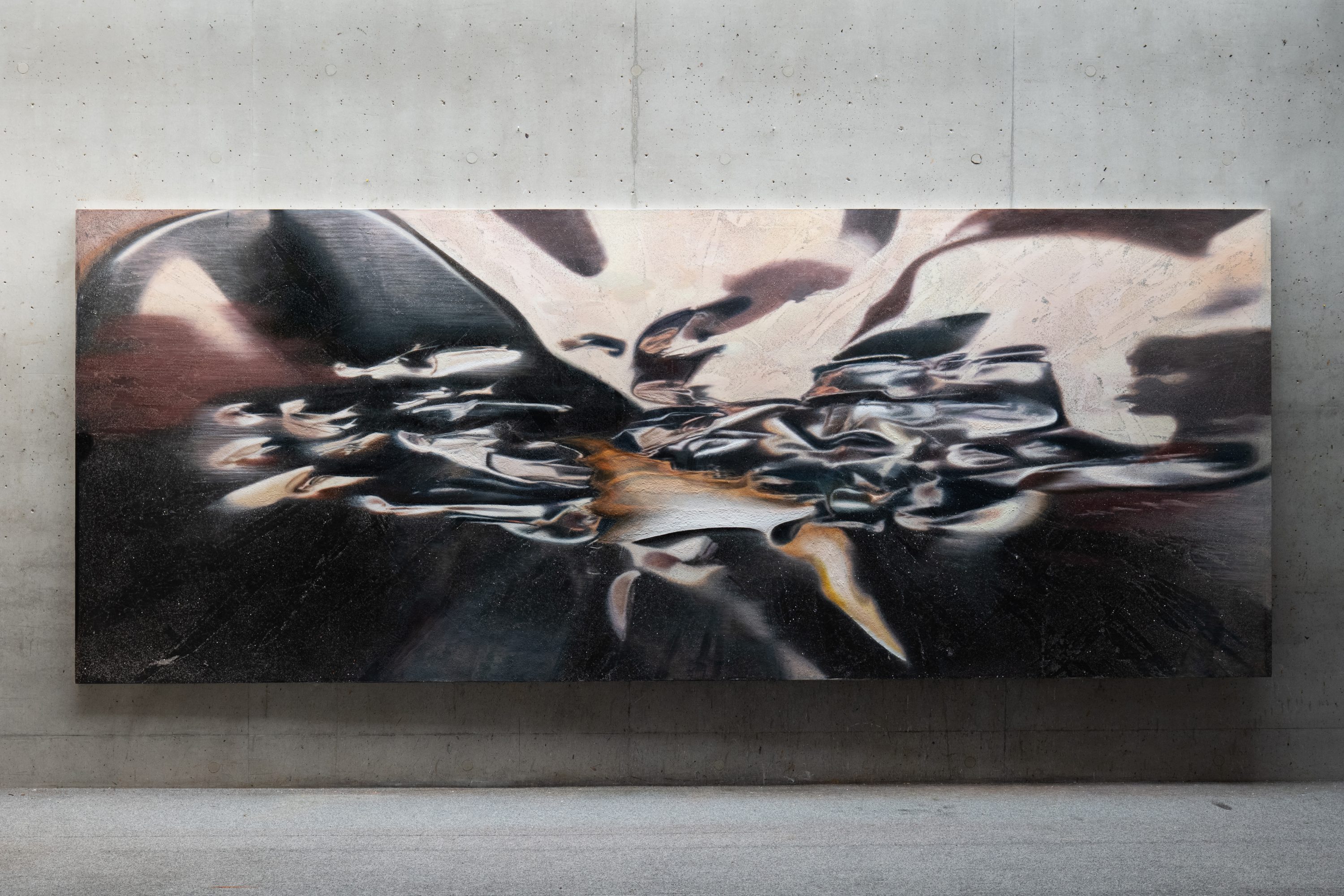 Bosisio has always pursued the expression of two contrary ideas of inorganic and organic matter, and he focuses a tranquil macro-perspective towards the worlds of each. He sees destruction and interference, but also a merging, and explores the unique dynamism within them. For the large painting, which is the fulcrum of the exhibition, the artist himself engaged in interference with and destruction of a metal object, and painted from photographs of the resulting form. The transformed metal matter, which underwent destruction at the hands of the artist – a physical body – encounters light, and while its identity has been destabilized, it remains, functioning like a trace of light. Through the aggressive process of destruction, its world impacts in a more vague and expansive territory, as though merging, spreading on the canvas like a universe. It captures what the material hides and reveals under pressure, the eternal interference and resonance between them, and a moment that is in constant transformation.